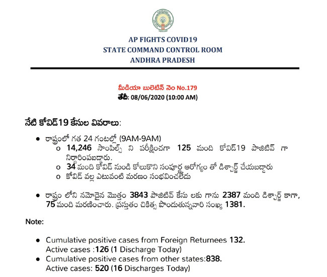 ఇంటర్నెట్ డెస్క్: ఏపీ కరోనా కేసుల తాజా బులెటిన్ను వైద్య, ఆరోగ్య, కుటుంబ సంక్షేమ శాఖ విడుదల చేసింది. తాజా వివరాల ప్రకారం గత 24 గంటల్లో మొత్తం 154 కరోనా పాజిటివ్ కేసులు నమోదయ్యాయి. కొత్తగా 14,246 శాంపిల్స్ను పరీక్షించగా 125 మంది కోవిడ్ 19 పాజిటివ్గా తేలారు. 34 మంది కోవిడ్ నుంచి కోలుకొని సంపూర్ణ ఆరోగ్యంతో డిశ్చార్జ్ అయ్యారు. ఇదిలా ఉంటే.. ఇతర ప్రదేశాల నుంచి వచ్చిన 29 మంది కరోనా పాజిటివ్గా నిర్ధారణ అయ్యారు. మొత్తంగా చూసుకుంటే 154 కేసులు నమోదయ్యాయని అధికారులు తెలిపారు. ఎలాంటి మరణాలు సంభవించలేదన్నారు. రాష్ట్రంలో ఇప్పటి వరకు నమోదైన మొత్తం 3843 కేసుల్లో 2387 మంది డిశ్చార్జ్ కాగా 75 మంది మరణించారు. ప్రస్తుతం 1381 మంది వివిధ ఆసుపత్రుల్లో చికిత్స పొందుతున్నారు.