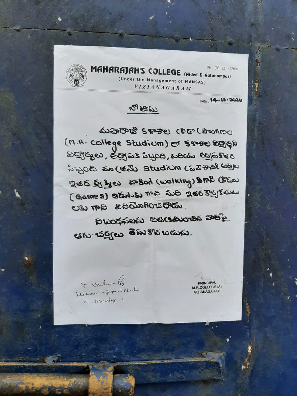 విజయనగరం: మాన్సాస్ చైర్ పర్సన్ సంచయిత గజపతిరాజు నిర్ణయాలు రోజురోజుకి వివాదాస్పద మవుతున్నాయి. తాజాగా మరో వివాదానికి ఆమె తెరతీశారు. నగరంలోని అయోధ్య మైదానానికి తాళాలు వేయడం వివాదానికి దారితీసింది. విద్యార్థులు, సిబ్బంది తప్ప మిగిలిన వారు లోపలికి వెళ్లకూడదని మహరాజా కాలేజీ ప్రిన్సిపాల్ నోటీసులు ఇచ్చారు. ఈ నిర్ణయంపై స్థానికులు మండి పడుతున్నారు. ఎన్నో ఏళ్లుగా కాలేజీ మైదానంలో నగర ప్రజలు వాకింగ్ చేస్తుండగా... తాజాగా తాళాలు వేయడం ఏంటని ప్రశ్నిస్తున్నారు. మాన్సాస్ యాజమాన్యం తీరుపై నగర ప్రజల ఆగ్రహం వ్యక్తం చేస్తున్నారు.