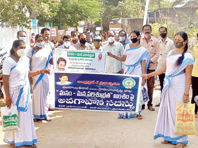 కవిటి:పరిసరాలను పరిశుభ్రంగా ఉంచుకోవల్సిన బాధ్యత అందరిపైనా ఉందని ఎంపీడీవో పి.సూర్యనారాయణ తెలిపారు. బుధవారం కవిటిలో వలంటీర్లు, గ్రామ సచివాలయ ఉద్యోగులు మనం-మన పరిశుభ్రత కార్యక్రమంలో భాగంగా పారిశుధ్యంపై ర్యాలీ నిర్వహించారు. ఈ సందర్భంగా మాట్లాడుతూ ప్రతిఇంట్లో తడి,పొడి చెత్త వేరుచేసి గ్రీన్ అంబాసిడర్ ద్వారా చెత్తసేకరణ కేంద్రానికి తరలించాలని తెలిపారు. కార్యక్రమంలో తహసీల్దార్ వి.విజయ్కుమార్, ఈవో జి.వెంకటరావు, బి.నాగు పాల్గొన్నారు.ఫ ఇచ్ఛాపురం రూరల్ : ధర్మపురంలో బుధవారం మనం-మన పరిశుభ్రత కార్యక్రమంలో భాగంగా వలంటీర్లు, సచివాలయ ఉద్యోగులు పారిశుధ్యంపై ర్యాలీ నిర్వహించి అవగాహన కల్పించారు. ఈ సందర్భంగా కార్యదర్శి కె.రవి మా ట్లాడుతూ చెత్త సేకరణకు ప్రతిఇంటి నుంచి రోజుకు రూ.రెండు చొప్పున్న నెలకు రూ.60 పంచాయతీకి చెల్లించాలని చెప్పారు. ఫసోంపేట: సోంపేటలో మనం - మన పరిశుభ్రత పక్షోత్సవాల్లో భాగంగా పంచాయితీ అధికారులు, వలంటీర్లకు అవగాహన సదస్సు నిర్వహించారు. సమావేశంలో తహసీల్దార్ సదాశివుని గురుప్రసాద్, ఎంపీడీవో సీహెచ్ శ్రీనివాసరెడ్డి, సోంపేట ఈవో తెంబ వాసు పాల్గొన్నారు. ఫసోంపేట రూరల్ : కొర్లాం పంచాయతీలో వలంటీర్లు, సచివాలయ, వైద్యఆరోగ్య సిబ్బంది, అంగన్వాడీ, ఆశ కార్యకర్తలువునం మన పరిశుభ్రత కార్యక్రమంలో భాగంగా ర్యాలీ చేశారు. కార్యక్రమంలో కార్యదర్శి ఎం.శాంతకుమారి పాల్గొన్నారు.