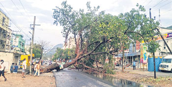 సింహాచలం, ఏప్రిల్ 25: మహావిశాఖ 98వ వార్డులో శనివారం మధ్యాహ్నం సుమారు గంటన్నర పాటు కురిసిన భారీ వర్షానికి గోశాల కూడలి నుండి ప్రభుత్వ ఆసుపత్రి మధ్య మార్గంలో మెయిన్ రోడ్డులోని శతాబ్దానికి కంటే ఎక్కువ చరిత్ర కలిగిన భారీ మర్రిచెట్టు కుప్పకూలింది. దాంతో విద్యుత్ సరఫరాకు అంతరాయం ఏర్పడింది. విద్యుత్శాఖ సిబ్బంది యుద్ధ ప్రాతిపదిక పనిచేసి చెట్టును యంత్రాల సహాయంతో తొలగించి ట్రాఫిక్కు ఎక్కువ సమయం అంతరాయం కలుగకుండా చేయగలగటం పట్ల స్థానికులు హర్షం వ్యక్తం చేశారు.