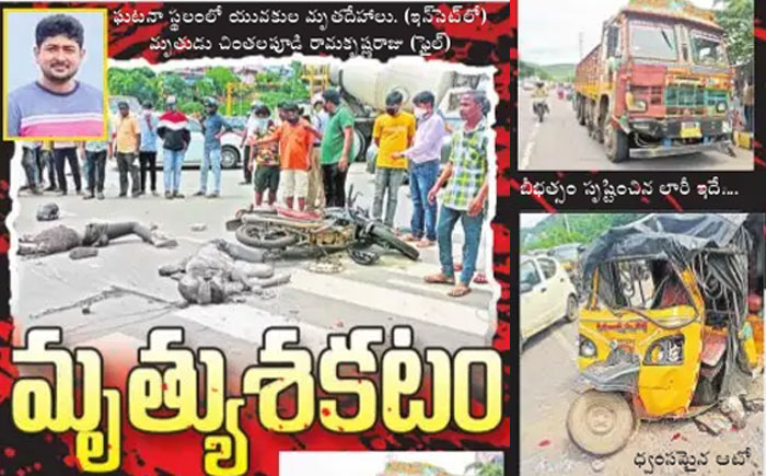 దీంతో బైక్లపై ఉన్న పశ్చిమగోదావరి జిల్లా ఉండికి చెందిన చింతలపూడి రామకృష్ణరాజు (29), విజయనగరం జిల్లా బాడంగి మండలం పిన్నవలస గ్రామానికి చెందిన పైలా రాము(29) అక్కడికక్కడే మృతిచెందారు. లారీ మరో రెండు కార్లు, రెండు ఆటోలను కూడా ఢీకొన్న తరువాత కొంతదూరం వెళ్లి ఆగిపోయింది. హఠాత్ పరిణామంతో అక్కడున్నవారంతా షాక్కు గుర య్యారు. ఏం జరిగిందో తెలుసుకు నేలోపే... రక్తపుమడుగులో యువకుల మృతదేహాలు, ధ్వంసమైన బైక్లు, ఆటోలు, కార్లతో ఆ ప్రాంతం భీతావహంగా మారింది. జంక్షన్లో ట్రాఫిక్ విధుల్లో వున్న పోలీసు సిబ్బంది వెంటనే 108కు, పోలీసు స్టేషన్కు సమాచారాన్ని అందించారు.