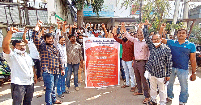 విజయనగరం రింగురోడ్డు, డిసెంబరు 11: తమ న్యాయపరమైన డిమాండ్లను పరిష్కరించాలని కోరుతూ ఏపీజీవీబీ ఉద్యోగులు శుక్రవారం ఆ బ్యాంకు ప్రధాన కార్యాలయం వద్ద నిరసన తెలియజేశారు. ఈ సందర్భంగా ప్రతినిధులు మధుసూధనరావు, మణికంఠ మాట్లాడుతూ.. జిల్లాల్లో 43 ప్రాంతీయ గ్రామీణ బ్యాంకులు, మారుమూల ప్రాంతాల్లో సైతం సేవలు అందిస్తున్నాయన్నారు. ఎస్బీఐ ప్రయోజిత 14 ఆర్ఆర్బీలు ఒకే గొడుగు కిందకు వచ్చి తమ డిమాండ్లను పరిశీలించాలని కోరారు. అన్ని రకాల రుణాలు, వాటిపై విధించే వడ్డీ రేట్లను యథాతథంగా అమలు చేయాలన్నారు. గ్రామీణ బ్యాంకులకు పదోన్నతుల విషయంలో స్పందించాలన్నారు. డిమాండ్లు పరిష్కారం కాకపోతే, ఉద్యమాన్ని తీవ్రతరం చేస్తామని హెచ్చరించారు. నిరసనలో గ్రామీణ బ్యాంకు ప్రతినిధులు పాల్గొన్నారు.