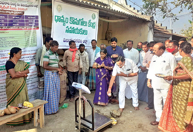 బొబ్బిలి రూరల్: గ్రామాల్లో ఏర్పాటు చేసిన ధాన్యం కొనుగోలు కేంద్రాల్లోనే రైతులు ధాన్యం విక్రయించాలని ఎమ్మెల్యే శంబంగి వెంకట చినప్పలనాయుడు అన్నారు. పక్కిలో శుక్రవారం ఆయన ధాన్యం కొనుగొలు కేంద్రాన్ని ప్రారంభించారు. ఈ సందర్భంగా ఆయన మాట్లాడుతూ స్పెషల్గ్రేడ్ ధాన్యం క్వింటా ధర రూ.1886, సాధారణ రకా నికి రూ.1860 మేర ప్రభుత్వం మద్దతు ధర చెల్లిస్తుంద న్నారు. ముందుగా బయోమెట్రిక్లో రైతులు పేర్లు నమోదు చేసుకోవాలని తెలిపారు. అనంతరం ఆయన మనం-మన పరిశుభ్రత కార్యక్రమంలో భాగంగా గ్రామాల్లో ర్యాలీ నిర్వ హించారు. ఉపాధి కార్డుల పంపిణీ చేశారు. కార్యక్రమంలో ఎమ్మెల్యే సోదరుడు శంబంగి వేణుగోపాలనాయుడు, తహసీల్దార్ లక్ష్మీప్రసాద్పాత్రో, ఏపీఎం అప్పలస్వామి తదితరులు పాల్గొన్నారు. మెరకముడిదాం : రైతు సంక్షేమమే ప్రభుత్వ ధ్యేయమని డీసీఎంఎస్ చైర్మన్ ఎస్వీ రమణరాజు తెలిపారు. సోమలింగాపురం పీఏసీఎస్లో ఏర్పాటుచేసిన ధాన్యం కొనుగోలు కేంద్రాన్ని ప్రారంభిం చారు. కార్యక్రమంలో జడ్పీటీసీ మాజీ సభ్యుడు కోట్ల విశ్వేశ్వ రరావు, వేణుగోపాలరావు, మోతీలాల్నాయుడు, నరేష్ కుమార్, కృష్ణమూర్తిరాజు, ఏవో శ్రీనివాస్ పాల్గొన్నారు.