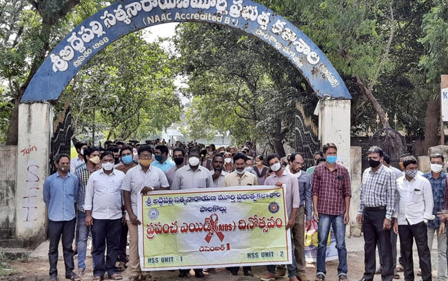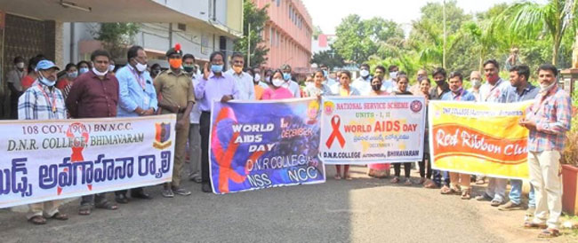 భీమవరం ఎడ్యుకేషన్ / అర్బన్: పట్టణంలోని డీఎన్నార్ కళాశాల ఎన్ఎస్ఎస్ యూనిట్ ఆధ్వర్యంలో ఎయిడ్స్పై అవగాహన ర్యాలీ, ప్రతిజ్ఞ నిర్వహించారు. కళాశాల అధ్యక్ష కార్యదర్శులు గోకరాజు నరసింహరాజు, గాదిరాజు సత్యనారాయణరాజు ఎయిడ్స్ మహమ్మారిని తరిమికొట్టాలని పిలుపునిచ్చారు. ప్రిన్సిపాల్ శాంతకుమారి మాట్లాడుతూ హెచ్ఐవీ నివార ణపై ప్రజలకు అవగాహన కల్పించాలన్నారు. పి.రామకృష్ణంరాజు, ఎంవీఎన్. భాస్కరరాజు, వీరయ్య, చెల్లబోయిన రంగారావు, ఎస్.అనిల్దేవ్, సోమయ్య, గౌతమ్కుమార్, అధ్యాపకులు, విద్యార్థులు పాల్గొన్నారు. శ్రీ విజ్ఞాన వేదిక ఆధ్వర్యంలో సెయింట్ మేరిస్ ఆసుపత్రిలో ఎయిడ్స్పై అవగాహన సదస్సు నిర్వహించారు. తోట భోగయ్య, సీఎస్ఎన్ కళాశాల ప్రిన్సిపాల్ ఎస్.సత్యనారాయణ, సిలిన్, అనిస్, ఆకుల పెద్దిరాజు తదితరులు పాల్గొన్నారు.