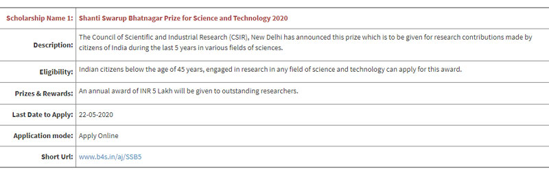 సైన్స్ అండ్ టెక్నాలజీ రంగాల్లో గత ఐదేళ్లుగా విశిష్ట సేవలు చేస్తున్న ప్రముఖ శాస్త్రవేత్తలకు ది కౌన్సిల్ ఆఫ్ సైంటిఫిక్ అండ్ ఇండస్ట్రియల్ రీసెర్చ్ (సీఎస్ఐర్) రివార్డులను ఇవ్వాలనుకుంటోంది. ‘శాంతి స్వరూప్ భట్నాగర్ ప్రైజ్ ఫర్ సైన్స్ అండ్ టెక్నాలజీ-2020’ పేరుతో ఈ రివార్డును అందజేయబోతోంది.. భారతీయులై ఉండి 45 ఏళ్ల వయసులోపు వారై ఉంటే ఈ రివార్డులకు అర్హులు. ఎంపికైన పరిశోధకులకు ఐదు లక్షల రూపాయలను అందిస్తారు. అర్హులైన వారు ఆన్లైన్లో 22-05-2020లోపు దరఖాస్తు చేయాలి.