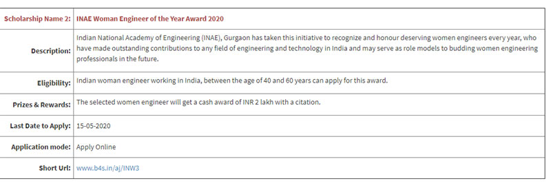 భారత్లో ఇంజనీర్గా పనిచేస్తున్న మహిళలందరికీ శుభవార్త.. గూర్గాన్లోని ఇండియన్ నేషనల్ అకాడమీ ఆఫ్ ఇంజనీరింగ్ (ఐఎన్ఏఈ) ఓ ప్రత్యేకమైన అవార్డను ప్రకటించింది. ‘విమెన్ ఇంజనీర్ ఆఫ్ ద ఇయర్ అవార్డ్-2020’ని పేరుతో మహిళా ఇంజనీర్లను సత్కరించాలనుకుంటోంది. ఇంజనీరింగ్ విభాగాల్లో కొన్నేళ్లుగా విశేష కృషి చేసిన మహిళలు ఈ అవార్డులకు అర్హులు. 40 నుంచి 60 ఏళ్ల లోపు వారు ఈ అవార్డులకై దరఖాస్తు చేసుకోవచ్చు. ఎంపికైన వారికి రూ.2 లక్షల రివార్డును అందజేస్తారు. దరఖాస్తుకు ఆఖరు తేదీ:15-05-2020