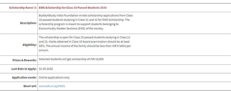ఆర్థికంగా వెనుకబడిన విద్యార్థులకు బడ్డీ4స్టడీ స్కాలర్షిప్లను ప్రకటించింది. పదో తరగతి ఉత్తీర్ణత సాదించి.. ఇంటర్మీడియట్ చదువుతున్న విద్యార్థులు ఈ స్కాలర్షిప్లకు దరఖాస్తు చేసుకోవచ్చు.. కనీసం 50శాతం మార్కులను పదో తరగతిలో సాధించి ఉండాలి. ఆయా విద్యార్థుల కుటుంబాల సంపాదన ఏడాదికి 6లక్షలలోపు ఉండాలి. ఈ స్కాలర్షిప్లకు ఎంపికైన విద్యార్థులకు ఏడాదికి రూ.10వేలు ఆర్థిక సాయం అందజేస్తారు. ఆన్లైన్లో దరఖాస్తునకు ఆఖరు తేదీ: 31-05-2020..