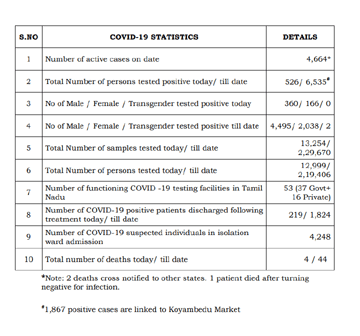 ఈ కేసులతో కలుపుకొని మొత్తం 6,535 కేసులను గుర్తించామని, 44 మంది మృత్యువాత పడ్డారని తెలిపింది. ఈ కేసుల్లో 1,867 కేసులు కోయంబత్తూరు మార్కెట్కు సంబంధించినవేనని తెలిపింది. కాగా ఇంకా 4,664 మంది ఆసుపత్రుల్లో చికిత్స పొందుతున్నారని వివరించింది.