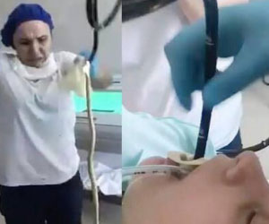 యువతిని పరీక్షించిన డాక్టర్లకు ఆమె కడుపులో ఏదో వస్తువు ఉన్నట్టు అర్థమైంది. ఆ తరువాత.. ఓ గట్టం ద్వారా ఆ వస్తువును బయటకు లాగిన డాక్టర్లకు వాంతి వచ్చినంత పనైంది. కారణం.. వారు బయటకు లాగిన వస్తువు.. ఓ పాము. ఆమె నోటి గుండా పామును బయటకు లాగుతుండగా చిత్రీకరించిన వీడియో ఒకటి ప్రస్తుతం నెట్టింట్లో వైరల్ అవుతోంది.
