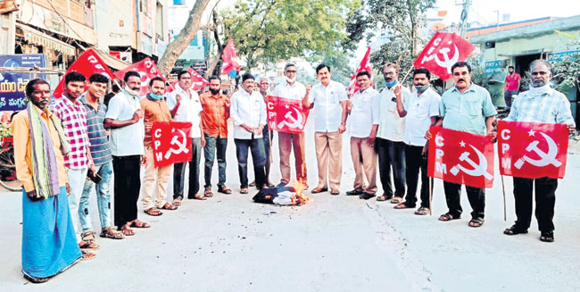 నేరేడుచర్ల/ సూర్యాపేటటౌన్/ అర్వపల్లి/ మునగాల/ కోదాడ రూ రల్/ తుంగతుర్తి, డిసెంబరు 29: రైతుల ఉద్యమం పట్ల కేసీఆర్ శిఖండిలా వ్యవహరిస్తున్నారని సీపీఎం రాష్ట్ర కార్యదర్శివర్గ సభ్యుడు జూలకంటి రంగారెడ్డి విమర్శించారు. నేరేడుచర్లలో మంగళవారం విలేకరుల తో మాట్లాడారు. కేంద్రం పెట్టే కేసులకు భయపడిపడి నల్లచట్టాలకు తల వంచుతున్నారన్నారు. సమావేశంలో రవినాయక్, నగేష్, అనంతప్రకాష్, వెంకటయ్య పాల్గొన్నారు. రైతులకు ఉచితంగా ఎరువులు ఇస్తామ ని ప్రకటించిన సీఎం కేసీఆర్ మాటమార్చారని సీపీఐ నాయకుడు ధూళిపాళ ధనుంజయనాయుడు ఆరోపించారు. నేరేడుచర్లలో మాట్లాడారు. సూర్యాపేటలో సీపీఎం నాయకులు సీఎం కేసీఆర్ దిష్టిబొమ్మను దహ నం చేశారు. నూతన వ్యవసాయ చట్టాలను సమర్థిస్తూ సీఎం కేసీఆర్ మాట్లాడడం దుర్మార్గమని సీపీఎం జిల్లా కార్యదర్శి మల్లు నాగార్జున్రెడ్డి అన్నారు. కార్యక్రమంలో నాయకులు నెమ్మాది వెంకటేశ్వర్లు, కొలిశెట్టి యాదగిరిరావు, కోటగోపి, వెంకట్రెడ్డి, శ్రీకాంత్ పాల్గొన్నారు. రాష్ట్ర ప్రభుత్వం ఐకేపీ కేంద్రాలను శాశ్వతంగా తొలగించాలనే నిర్ణయం సరికాదని సీపీఐ(ఎంఎల్) జిల్లా కార్యదర్శి మండారి డేవిడ్కుమార్ అన్నారు. సీపీఎం నాయకులు అర్వపల్లిలో తహసీల్దార్కు వినతిపత్రం అందజే శారు. కార్యక్రమంలో వజ్జె శ్రీనివాస్, వెంకన్న, మల్లయ్య, యాకలక్ష్మి, నర్స య్య, వజ్జె సైదయ్య పాల్గొన్నారు. ప్రభుత్వాలు కుమ్మక్కై రైతులను మో గిస్తున్నాయని ఐఎన్టీయూసీ రాష్ట్ర ప్రధానకార్యదర్వి యరగాని నాగన్నగౌడ్ అన్నారు. హుజూర్నగర్లో జరిగిన సమావేశంలో మా ట్లాడారు. సమావేశంలో బెల్లంకొండ గురవయ్య, రామ్మూర్తి, రామరాజు, ముక్కంటి, జానయ్య ఉన్నారు. మునగాలలో కాంగ్రెస్ నాయకులు రాస్తారోకో చేశా రు. కార్యక్రమంలో కాంగ్రెస్ కిసాన్ సెల్ జిల్లా అధ్యక్షుడు బచ్చు అశోక్, పందిరి నాగిరెడ్డి, ఎలక నరేందర్రెడ్డి, వేమూరి సత్యనా రాయణ పాల్గొ న్నారు. కోదాడ, తుంగతుర్తిలో సీపీఎం నాయకులు తహసీల్దార్లకు వి నతి పత్రం అందజేశారు. కార్యక్రమంలో నాయకులు మిట్టగణుపుల ముత్యాలు, దాసరి శ్రీనివాస్, కొలిశెట్టి యాదగిరిరావు, శ్రీనివాస్ పాల్గొన్నారు.