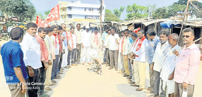 బీబీనగర్ : రైతు వ్యతిరేక చట్టాలను రద్దు చేసి విద్యుత్ ప్రైవేటీకరణ ఆపాలని బీబీనగర్లో సీపీఎం ఆధ్వర్యంలో కేంద్ర ప్రభుత్వ దిష్టిబొమ్మను దహనం చేశారు. బీజేపీ ప్రభుత్వం కార్పొరేట్ శక్తుల ప్రయోజనం కొరకు రైతు వ్యతిరేక చట్టాలు తెచ్చిందన్నారు. కార్యక్రమంలో నాయకులు సత్యనారాయణ, శ్రీరాములు, శ్రవణ్, భాను, శివ, భరత్, పోచయ్య పాల్గొన్నారు.
