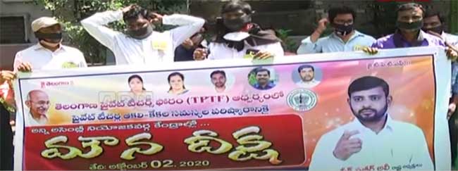 హైదరాబాద్: రాష్ట్ర వ్యాప్తంగా వేలాదిమంది టీచర్ల దయనీయ స్థితికి నిరసనగా లంగర్హౌస్లోని బాపు ఘాట్ ఎదుట ప్రైవేటు ఉపాధ్యాయులు నల్ల రిబ్బన్లు ధరించి మౌన దీక్ష చేపట్టారు. స్కూల్స్ యాజమాన్యాలు విద్యార్థుల నుంచి అధిక ఫీజులు వసూలు చేస్తున్నా.. తమకు సరిపడ జీతాలు ఇవ్వడంలేదని ఉపాధ్యాయులు ఆవేదన వ్యక్తం చేశారు. తమకు సరిగా జీతాలు లేక అనేక ఇబ్బందులు ఎదుర్కొంటున్నామని అన్నారు.