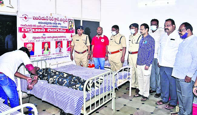 రాప్తాడు/ అనంతఅర్బన: పోలీసు అమర వీరుల వారోత్సవాల సందర్బంగా గురువారం రాప్తాడు ఆర్డీటీ కార్యాలయంలో రాప్తాడు, ఇటుకలపల్లి పోలీసులు సీఐ విజయభాస్కర్గౌడ్ ఆధ్వర్యంలో రక్తదానం చేశారు. పోలీసు సిబ్బందితో పాటు అనంతలక్ష్మి, శ్రీవెంకటేశ్వర ఇంజనీరింగ్ కళాశాలల్లో విద్యార్థులు మొత్తం 94 మంది రక్తదానం చేశారు. ఈ సందర్భంగా సీఐ మాట్లాడుతూ.... సమాజంపై అవ గాహ న కలిగిఉండాలని, సేవా భావాలను అలవర్చుకోవాలన్నారు. ఈ కార్యక్రమంలో రాప్తాడు ఎస్ఐ రాఘవరెడ్డి, పోలీసు సిబ్బంది, విద్యార్థులు పాల్గొన్నారు. అలాగే రక్తదానం చేసిన అనంతలక్ష్మి కళాశాల చైర్మన అనంతరాముడు, వైస్చైర్మన రమేష్నాయుడుకు అభినందనలు తెలిపా రు. అనంతరం ఆర్డీటీ బ్లడ్బ్యాంక్ సిబ్బంది దాతల నుంచి రక్తాన్ని సేక రించారు. కార్యక్రమంలో రాప్తాడు ఎస్ఐ రాఘవరెడ్డి, జాతీయ సేవా పథకం అధికారి ఖలీల్బాషా, నవీనకుమార్, సిబ్బంది పాల్గొన్నారు.