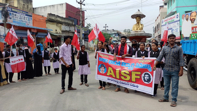మదనపల్లె టౌన్, అక్టోబరు 28: పట్టణంలోని బీటీ కళాశాలను ప్రభుత్వపరం చేయాలని ఏఐఎస్ఎఫ్ జిల్లా ఉపాధ్యక్షుడు నవీన్కుమార్ డిమాండ్ చేశారు. గురువారం బీసెంట్ సర్కిల్ వద్ద ఏఐఎస్ఎఫ్ ఆధ్వర్యంలో విద్యార్థులు నిర్వహించిన రాస్తారోకో సందర్భంగా ఆయన మాట్లాడుతూ వందేళ్ల చరిత్ర వున్న బీటీ కళాశాలను ఎయిడెడ్ అధ్యాపకులు ప్రభుత్వంలో విలీనం అయ్యారన్నారు. బీసీటీ యజమాన్యం ఆస్తులను ప్రభుత్వానికి అప్పగించకుండా, కళాశాలను మూసివేసే ధోరణిలో ఉందన్నారు. దీని వలన పేద విద్యార్థులకు విద్య అందడం కష్టతరమన్నారు. ఇప్పటికైనా కళాశాల ఆస్తులను ప్రభుత్వానికి అప్పగించాలని బీసీటీని డిమాండ్ చేశారు. మాధవ, జయప్రకాష్, చైతన్య, సంతోష్, స్నేహ, రమ్యశ్రీ, మీనా, భవ్య తదితరులు పాల్గొన్నారు.