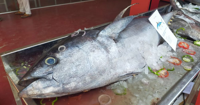 తిరుపతి అన్నారావు సర్కిల్లో ‘ది మీట్ ఫ్యాక్టరీ’ పేరుతో నూతనంగా ఏర్పాటైన మాంసాహార దుకాణంలో ఆదివారం అరుదైన ట్యూనా ఫిష్ కనిపించింది.