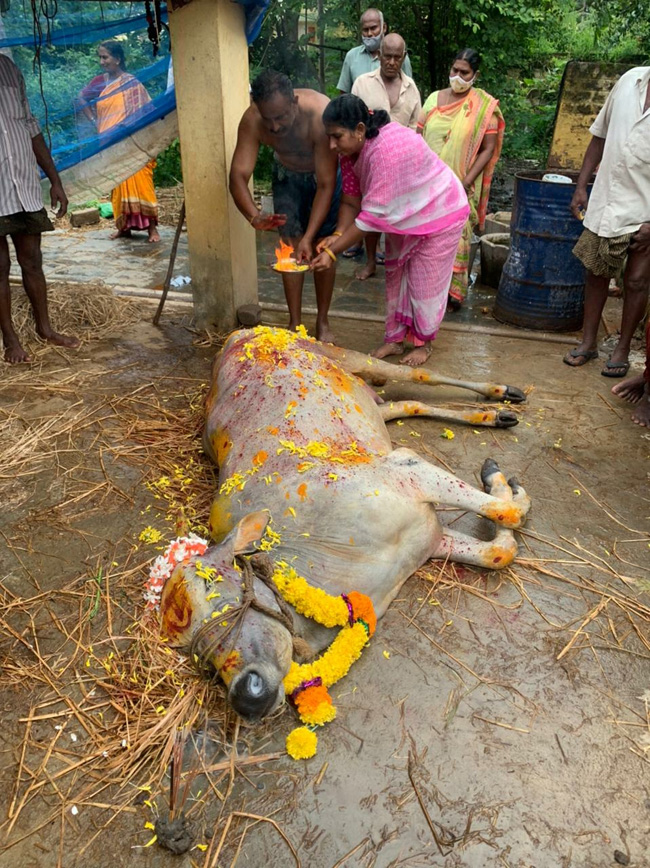 ఘంటసాల, ఆగస్టు 27 : మనిషి ప్రేమకు ఎల్లలుండవు. అది అయినవారి మీదైనా, పశువుల మీదైనా. ఎంతగా ప్రేమిస్తారో, దూరమైతే అంతగా విలవిల్లాడిపోతారు. రైతైతే తనను పోషిస్తున్న పశువులపై మరింత ప్రేమను పెంచుకుంటాడు. తాను కంటికి రెప్పలా చూసుకుంటున్న గోవు మృతి చెందటంతో ఓ రైతు కుటుంబం విలవిల్లాడిపోయింది. ఘంటసాల మండలం చిట్టూర్పు గ్రామానికి చెందిన రైతు గుత్తికొండ వరప్రసాద్కు చెందిన మూడోతరం ఆవుకు నెలలు నిండి దూడకు జన్మనివ్వబోయే సందర్భంలో అనారోగ్యానికి గురైంది. ఆవును కాపాడుకోవడానికి గన్నవరంలో ఉన్న పశువైద్య కళాశాలకు తీసుకెళ్లి శస్త్రచికిత్స చేయించారు. అప్పటికే కడుపులో మృతిచెందిన దూడను బయటికి లాగి ఆవుకు ఎటువంటి ఇబ్బంది లేకుండా చూశారు. అయితే, ఇంటికొచ్చిన మరుసటిరోజే ఆవు మరణించింది. దీంతో వరప్రసాద్ కుటుంబసభ్యులు కన్నీంటిపర్యంతమయ్యారు. మృతిచెందిన ఆవుకు ప్రత్యేక పూజలు చేసి శాస్త్రోక్తంగా తమ పొలంలో అంత్యక్రియలు చేశారు. గ్రామస్థులు ప్రత్యేక పూజలు చేశారు.