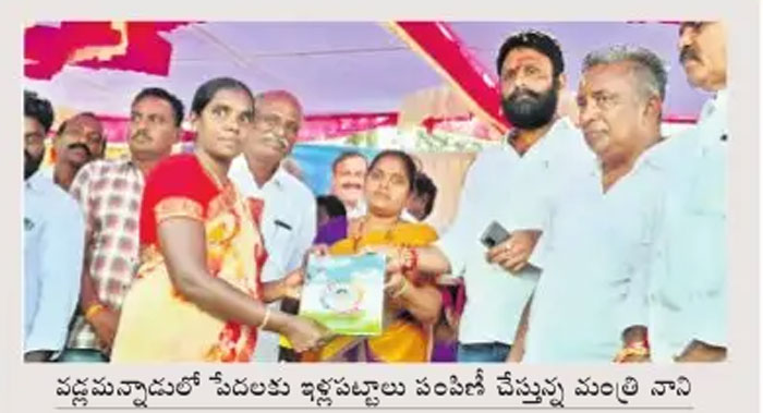 గుడ్లవల్లేరు(కృష్ణా): వచ్చే ఫిబ్రవరిలో ముఖ్యమంత్రి వైఎస్ జగన్మోహన్రెడ్డి రచ్చ బండ నిర్వహించనున్నారని, రాష్ట్రంలో అర్హులైన నిరుపేదలందరికీ ఇళ్లస్థలాలు, ప్రభుత్వ సంక్షేమ పథకాలు అందించాలన్నదే లక్ష్యంగా ప్రభుత్వం పనిచేస్తోం దని మంత్రి కొడాలి శ్రీ వెంకటేశ్వరరావు (నాని) అన్నారు. సోమవారం గుడ్లవల్లేరు మండలం వడ్లమన్నాడులో నిర్వహించిన ఇళ్లపట్టాల పంపిణీలో మంత్రి నాని మాట్లాడారు. ఎన్నికల మానిఫోస్టోను మొదటి ఏడాదిలోనే 99 శాతం పూర్తి చేశామని టీడీపీ అధికారంలోకి వచ్చినపుడు ప్రజలకిచ్చిన వాగ్దానాలను మొదటి మూడేళ్లు గాలికొదిలేసి చివరి ఆరునెల్లలో హడావుడి సృష్టించారన్నారు. తహసీల్దార్ ఆంజనేయులు, జిల్లా రైతు సలహామండలి సభ్యులు పెన్నేరు ప్రభాకరరావు, పీ.ఏ.సీ.ఎస్ చైర్మన్ శేషం గోపి, వీఆర్ఓ భాస్కర్, కొండాలమ్మ దేవస్థాన చైర్మన్ కనుమూరి రామిరెడ్డి, మండల పార్టీ కన్వీనర్ శాయిన రవికుమార్, అల్లూరి ఆంజనేయిలు, కోగంటి ధనుంజయ్ పాల్గొన్నారు.