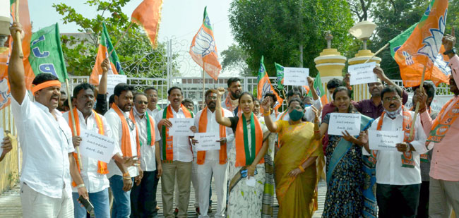 నగరంలోకి కలెక్టరేట్‌ వద్ద నిరసన తెలుపుతున్న బీజేపీ నాయకులు