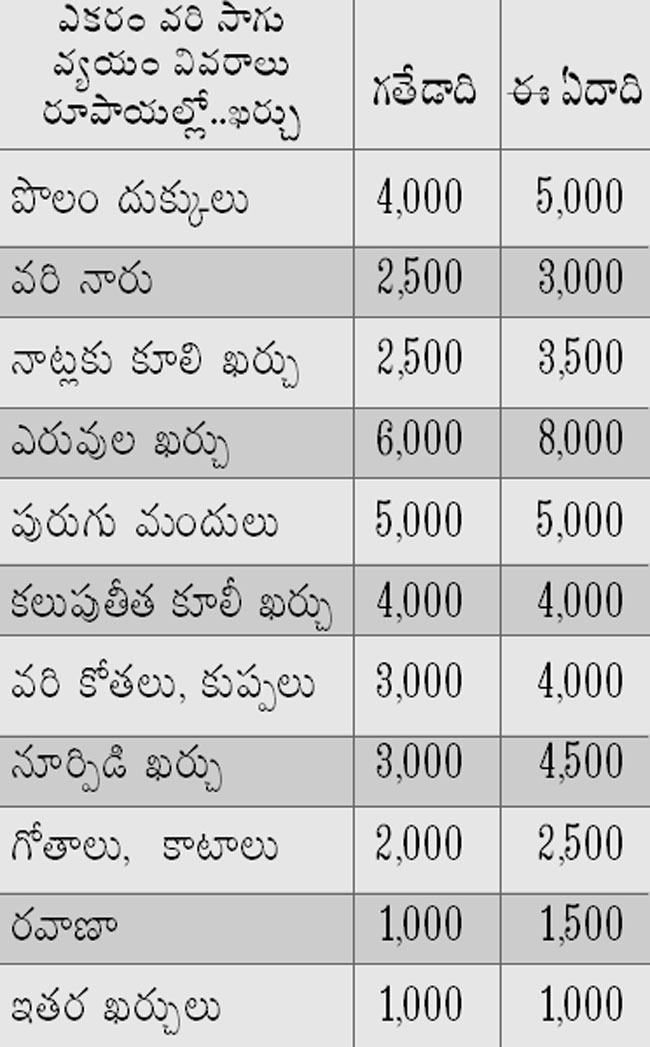 ఆంధ్రా అంటేనే అన్నపూర్ణగా ప్రసిద్ధి. రాష్ట్రంలో ప్రధాన ఆహార పంట వరి. రాష్ట్రంలో అత్యధికంగా పండించే పంట ఇదే. లక్షలాది ఎకరాల్లో సాగు చేస్తారు. కృష్ణా, గోదావరి, పెన్నా, వంశధార, నాగావళి నదుల ఆయకట్టులో వరి సాగే కీలకం. ప్రకృతి విపత్తులు, సాగునీటి సమస్యలు, కాల్వల దుస్థితి, ఏటేటా పెరుగుతున్న పెట్టుబడులు, కూలీల సమస్యలు, గిట్టుబాటు ధర లేకపోవడం, దళారుల దోపిడీ, మిల్లర్ల మాయజాలం తదితర కారణాలతో వరి సాగు కష్టంగా మారిందన్న భావన అన్నదాతల్లో వ్యక్తమవుతోంది. నిరుడు ఖరీ్ఫలో పండిన పంట తుఫాన్లకు దెబ్బతినగా, తడిసిన ధాన్యాన్ని తక్కువ ధరకు కొన్నారు. పంట నష్టానికి ప్రభుత్వం తగిన పరిహారం ఇవ్వకుండా నామమాత్రంగా ఇన్పుట్ సబ్సిడీ ఇచ్చి చేతులు దులుపుకొంది. రబీలో పండిన ధాన్యాన్ని అందరి దగ్గర కొనకపోవడంతో తక్కువ ధరకు దళారులకు అమ్ముకోవాల్సి వచ్చింది. దీంతో రైతులకు మద్దతు ధర దక్కలేదు. పైగా పౌరసరఫరాల సంస్థకు అమ్మిన రైతులకు నెలల తరబడి సొమ్ము చెల్లించకుండా బకాయిలు పెట్టారు. ఓ వైపు ఖర్చులు పెరగగా, మరో వైపు మద్దతు ధర లభించక కొందరు రైతులు వరి సాగు తగ్గించుకుంటున్నట్లు తెలుస్తోంది. పెట్రోల్, డీజిల్, ఎరువుల ధరల పెరుగుదల కూడా వరిసాగుపై ప్రతికూల ప్రభావానికి కారణమైంది.