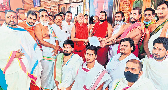 పెందుర్తి-రూరల్, నవంబరు 3: తూర్పు గోదావరి జిల్లా అన్నవరం దేవస్థానానికి చెందిన వ్రత పురోహితులు బుధవారం చినముషిడివాడలోని శారదాపీఠానికి తరలివచ్చారు. పీఠాధిపతి స్వరూపానందేంద్ర సరస్వతి, ఉత్తరాధికారి స్వాత్మానందేంద్ర సరస్వతిలను కలిసి ఆశీస్సులు తీసుకున్నారు. దేవస్థానంలో సత్యనారాయణస్వామి వ్రతాల ద్వారా వచ్చే ఆదాయంలో మరో పది శాతం పర్సెంటేజీలను పెంచుతూ ప్రభుత్వం జీవో జారీ చేయడం పట్ల పురోహితులు హర్షం వ్యక్తం చేశారు. ఇందుకు సహకరించిన పీఠాధిపతులకు కృతజ్ఞతలు తెలుపుతూ కృతజ్ఞతా పత్రాన్ని అందజేశారు.