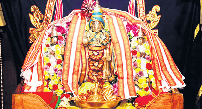 సింహాచలం, డిసెంబరు 26: సింహాద్రి అప్పన్న స్వామికి ఆదివారం ఘనంగా స్వర్ణ పుష్పార్చన నిర్వహించారు. ఇందులో భాగంగా సుప్రభాత సేవతో స్వామివారిని మేల్కొలిపి ప్రభాత ఆరాధనలు యథావిధిగా జరిపాక ఉత్సవమూర్తి గోవిందరాజస్వామిని ఉభయ దేవేరులతో కల్యాణ మండపంలో వుంచి భక్తుల గోత్ర నామాలతో అర్చకులు పూజలు చేసి నృసింహ అష్టోత్తర శతనామావళితో స్వర్ణ సంపెంగలతో స్వామిని అర్చించారు. కాగా అప్పన్న నిత్యాన్న ప్రసాద పథకానికి పశ్చిమగోదావరి జిల్లా మార్టేరుకు చెందిన వెలగల నాగమురళీ రూ.లక్ష విరాళంగా సమర్పించారు.