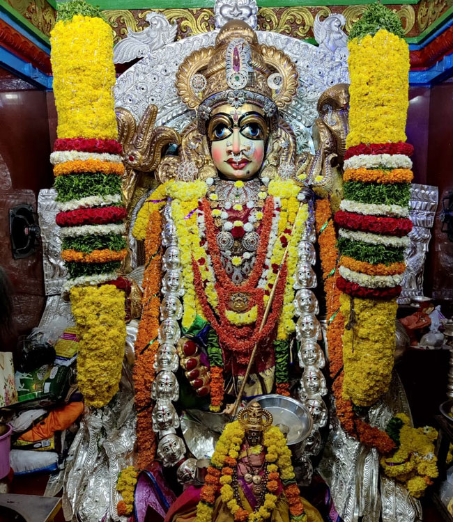 మావుళ్లమ్మ అమ్మవారికి భక్తుడు సమర్పించిన గజమా లను బుధవారం అర్చకులు అలంకరించారు.