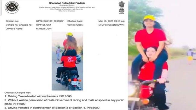 ఘజియాబాద్: ఓ బైక్ మీద ఇద్దరు అమ్మాయిలు ప్రమాదకరమైన విన్యాసాలు చేస్తూ కెమేరాలకు చిక్కడంతో పోలీసులు వారికి భారీ జరిమాన విధించారు. వీరు చేస్తున్న స్టంట్‌ను కొందరు వీడియో తీసి సోషల్ మీడియాలో పోస్టు చేయడంతో అది వైరల్‌గా మారి పోలీసుల దృష్టికి వెళ్లింది. యువతులను ఉత్తర ప్రదేశ్‌లోని ఘజియాబాద్‌కు చెందిన వారిగా గుర్తించారు. హెల్మెట్ ధరించకపోవడం, అనుమతులు లేకుండా రేసింగ్‌ జరపడం సహా  పలు డ్రైవింగ్ నిబంధనలను ఉల్లంఘించినందుకు పోలీసులు ఆ బైక్ యజమానికి మొత్తం 11 వేల రూపాయల చలాన్లు జారీ చేశారు.