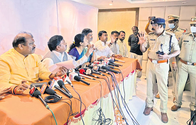 పోలీసుల ఆంక్షలతో బీజేపీ నేతల ప్రెస్మీట్లో ఉ ద్రిక్తత నెలకొనగా, అదే సమయంలో ఇద్దరు సీనియర్ నేతలు ఒకరిపై ఒకరు తీవ్ర వ్యాఖ్యలు చేసుకున్నారు. అయితే మీడియా సిబ్బంది అక్కడే ఉండటంతో వారు వెంటనే గప్చుప్ అయిపోయారు.