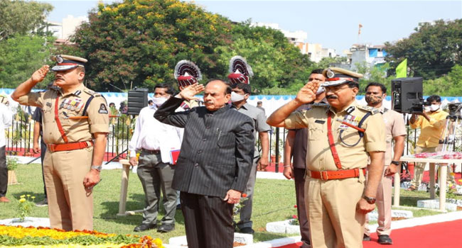 హైదరాబాద్: పోలీసు అమర వీరుల దినోత్సవాన్ని పురస్కరించుకొని గోషామహల్ స్టేడియంలోని పోలీసు అమరవీరుల స్తూపం వద్ద రాష్ట్ర గవర్నర్ డా. తమిళ సై సౌందర్ రాజన్ ఘననివాళులు అర్పించారు. గురువారం గోషామహల్ లో నిర్వహించిన కార్యక్రమంలో హోమ్ శాఖ మంత్రి మహమూద్ అలీ, డీజీపీ ఎం.మహేందర్ రెడ్డి తోపాటు పలువురు రిటైర్డ్ డీజీపీలు, సీనియర్ పోలీసు అధికారులు, రిటైర్డ్ పోలీసు అధికారులు, అమర పోలీసుల కుటుంబ సభ్యులు హాజరై విధి నిర్వహణలో ప్రాణాలు కోల్పోయిన పోలీసు అమర వీరులకు ఘనంగా నివాళులు అర్పించారు. ఈ సందర్బంగా అమరులు వారు పుస్తకాన్ని ఆవిష్కరించిన అనంతరం హోమ్ మంత్రి మహమూద్ అలీ మాట్లాడుతూ, రాష్ట్రంలో అమలవుతున్న పటిష్టమైన పోలీసింగ్ వల్లనే మెరుగైన శాంతి భద్రతలున్నాయని అన్నారు. ప్రత్యేక తెలంగాణా రాష్ట్ర ఆవిర్భావం అనంతరం ఇప్పటి వరకు విధి నిర్వహణలో రాష్ట్రంలో కేవలం ఒక పోలీసు మాత్రమే మరణించారని, ఈ సంవత్సరం ఒక్కరు కూడా మరణించలేదని పేర్కొన్నారు.