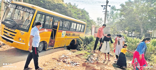 యాదాద్రిరూరల్‌, నవంబరు 8: ప్రైవేట్‌ స్కూల్‌ బస్సుకు త్రుటిలో ప్రమాదం తప్పింది. ఈ ఘటన యాదగిరిగుట్ట పట్టణంలో సోమవారం జరిగింది. స్థానికులు తెలిపిన వివరాల ప్రకారం... బీబీనగర్‌లోని ఓ ప్రై వేట్‌ పాఠశాలకు చెందిన బస్సు 15 మంది విద్యార్థులతో బయలుదేరింది. స్థానిక సంత(అంగడి) ప్రాంతంలోని రోడ్డు నుంచి వస్తున్న క్రమంలో  మూలమలుపు వద్ద తిరుగుతుండగా ప్రమాదవశాత్తు మురుగుకాల్వలో వెనుక టైరు దిగబడింది. దీంతో బస్సు ఒక వైపునకు ఒరిగింది. బస్సులో ని విద్యార్థులు భయాందోళనకు గురయ్యారు. డ్రైవర్‌ విద్యార్థులను వెంట నే కిందికి దింపాడు. ఒరిగిన పక్కనే విద్యుత స్తంభం ఉంది. ఒక వేళ దా నికి తాకితే పెనుప్రమాదం జరిగేదని స్థానికులు పేర్కొన్నారు. ఎలాంటి ప్రమాదం జరగకపోవడంతో అంతా ఊపిరి పీల్చుకున్నారు. బస్సును ఎ క్సకవేటర్‌ సహాయంతో బయటికి తీసి, అదే బస్సులో విద్యార్థులను పాఠశాలకు తరలించారు. రోడ్డుకు మరమ్మతులు చేయకపోవడంతోనే ప్రమా దం చోటుచేసుకుందని స్థానికులు తెలిపారు.