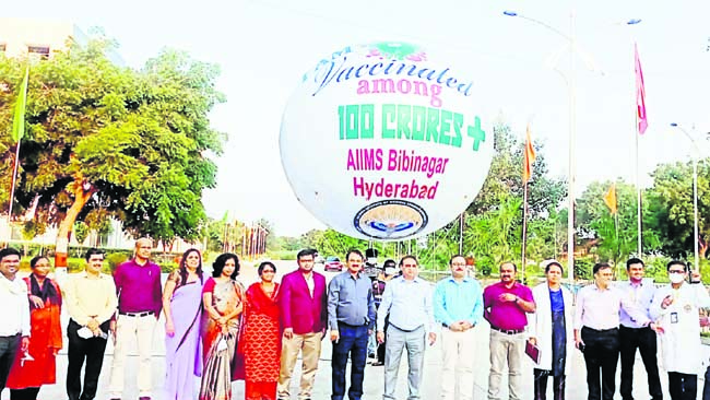 బీబీనగర్, అక్టోబరు 28: సమష్టి కృషితోనే దేశంలో 100 కోట్ల మందికి వ్యాక్సినేషన్ పూర్తి అయినట్లు ఎయిమ్స్ డైరెక్టర్ వికాస్ భాటియా అన్నారు. దేశంలో 100 కోట్ల మందికి వ్యాక్సినేషన్ పూర్తయిన సందర్భంగా ఎయిమ్స్లో వేడుకలు నిర్వహించారు. ఈ సందర్భంగా ఆయన మాట్లాడుతూ 130 కోట్ల జనాభా కలిగిన భారత దేశంలో అనతికాలంలోనే వంద కోట్ల మందికి వ్యాక్సినేషన్ చేయడం హర్షణీయమన్నారు. అంతకుముందు ఎయిమ్స్ ప్రధాన ద్వారం ఎదుట ‘వ్యాక్సినేటెడ్ అమాంగ్ 100 క్రోర్స్’ అని రాసిన బెలూన్లను ఆకాశంలో ఎగురవేశారు.