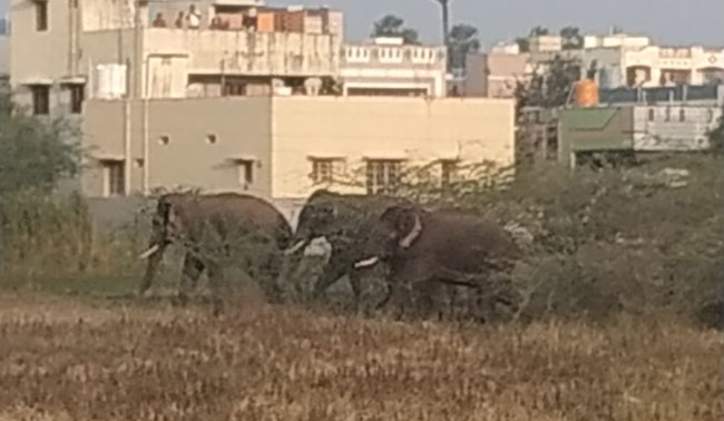 రేణిగుంట,మార్చి15: పడమటి మండలాలను గజగజలాడించే ఏనుగుల సమూహం ఇప్పుడు తూర్పు ప్రాంతాల పనిపడు తోంది. రేణిగుంట మండలం గాజుల మండ్యం శివారుప్రాంతం లో మంగళవారం ఉదయం మూడు గజరాజులు కనిపించాయి. మూడు రోజులుగా వడమాలపేట, రేణిగుంట మండలాల సరిహద్దులలో ఇవి సంచరించినట్టు స్థానికులు చెబుతున్నారు. సర్పంచ్ జి. రమే్షతో పాటు పలువురు తమకు తెలిసిన అటవీశాఖ, పోలీసు అధికారులకు సమాచారం అందించడంతో ఎస్ఐ ధర్మారెడ్డి, రేంజర్ అశోక్ కుమార్ యాదవ్ సిబ్బందితో ఘటనాస్థలికి చేరుకున్నారు. అప్పటికే గ్రామంలో పంచాయతీ సిబ్బంది ద్వారా ఏనుగులను గ్రామంలోకి రాకుండా డప్పులు కొట్టించారు. గ్రామ ప్రజలు ఇంటినుంచి బయటికి రాకుండా చర్యలు చేపట్టారు.డీఎఫ్వో నరేంద్రన్ గాజుల మండ్యం చేరుకుని పరిస్థితిని సమీక్షించారు. ఏనుగుల నుంచి గ్రామస్తులకు ఎలాంటి ప్రమాదం జరక్కుండా ముందస్తు జాగ్రత్తలు తీసుకోవాని అటవీఅధికారులకు సూచించారు. తెలుపు రంగు దుస్తులు ధరించిన వారిని పరిసర ప్రాంతాలకు దూరంగా ఉండేలా ప్రజలకు సూచించాలని ఆయన ఆదేశించారు.ఈ ఏనుగులు ఒకటి రెండు రోజుల్లో వేరేప్రాంతానికి వెళ్లి పోయే అవకాశం ఉందని తెలిపారు. ఏనుగుల వలన పంట నష్టం జరిగితే తమ పరిస్థితి ఏంటని గ్రామస్తులు అధికారులను నిలదీశారు.ఆందోళన చెందకుండా సచివాలయంలో ఫిర్యాదు చేస్తే పరిహారం వస్తుందన్నారు. ఒక చోటనుంచి మరో అటవీ ప్రాంతానికి సంచరించే క్రమంలో ఏనుగులు దారితప్పి వచ్చినట్టుగా డీఎఫ్వో అభిప్రాయపడ్డారు.ప్రజలు భయాందో ళనలకు గురికావాల్సిన అవసరం లేదన్నారు.సాయంత్రానికి గ్రామ సమీపంలో ఉన్న ఏనుగులను స్వర్ణముఖి నదినుంచి తూర్పు ప్రాంతాలకు తరలి వెళ్లేవిధంగా చర్యలు తీసుకోవడంతో ప్రజలు ఊపిరి పీల్చుకున్నారు.