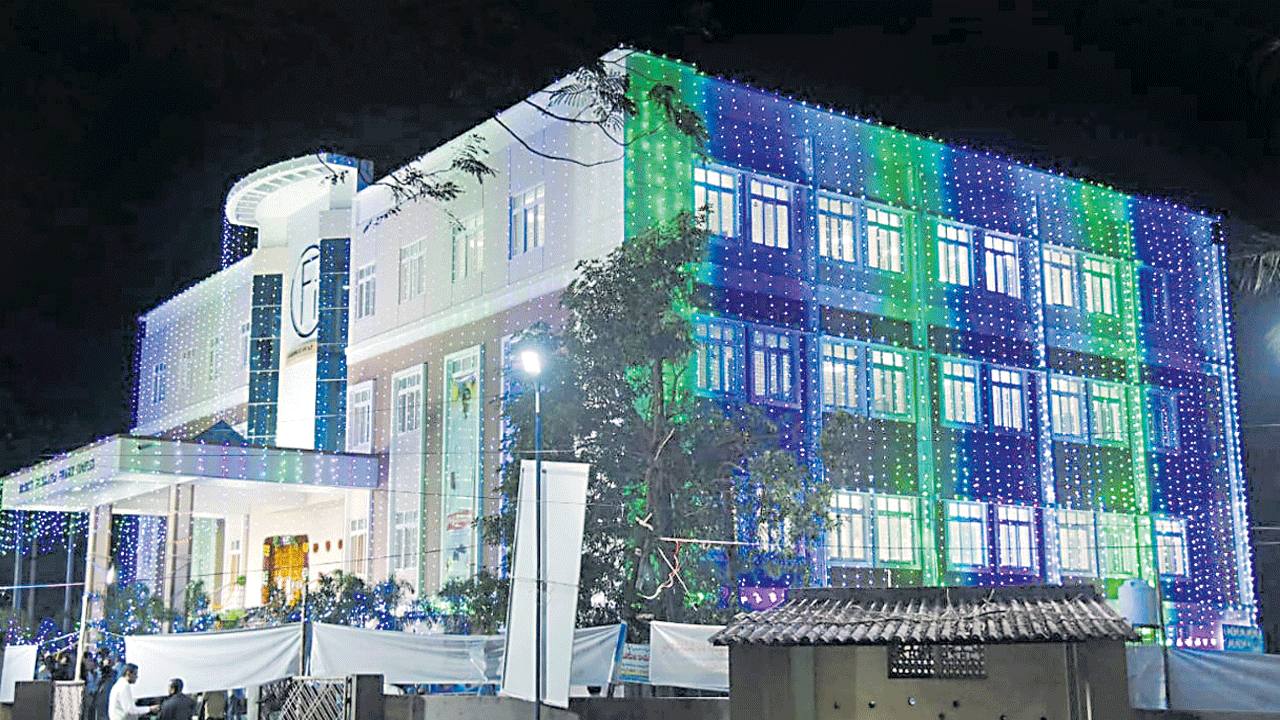 కొత్త భవనానికి వైసీపీ రంగులతో విద్యుత్ దీపాలంకరణపై సర్వత్రా విమర్శలు