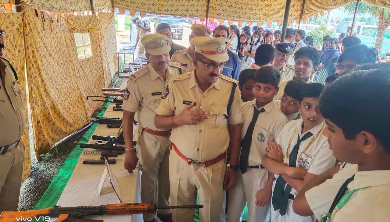 భీమవరం క్రైం, అక్టోబరు 27: శాంతి భద్రతల పరిరక్ష ణపై విద్యార్థులకు అవగాహ న కార్యక్రమం నిర్వహించారు. పోలీసు అమరవీరుల సంస్మరణ దినోత్సవ కార్యక్ర మాల్లో భాగంగా జిల్లా పోలీస్ కార్యాలయంలో గురువారం ఓపెన్ హౌస్ కార్యక్రమం నిర్వహించారు. పోలీసులు విధి నిర్వహణలో భాగంగా వినియోగించే ఆయుధాలు, దుస్తులు, పనిముట్లు, నేర దర్యాప్తు విధానం తదితర విషయాలను ఏఎస్పీ (అడ్మిన్) ఏవీ సుబ్బరాజు విద్యార్థులకు వివరించారు. డాగ్ స్క్వాడ్ బృందాలు, బాంబు డిస్పోజల్ పరికరాలు, ఫింగర్ ప్రింట్, పోలీస్ కంట్రోల్ రూమ్, కమ్యూనికేషన్, మ్యాస్ ప్యాక్ సెట్స్ పనిచేయు విధానం గురించి ఏఎస్పీ వివరించారు. ఆర్ఐ శ్రీకాంత్, ఎస్ఐ రాజేష్, సిబ్బంది పాల్గొన్నారు.