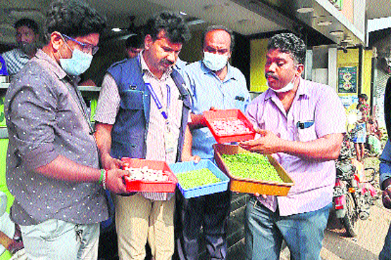 చెన్నై: కోయంబేడు మార్కెట్లో రసాయనపు రంగులు కలిపిన కాయగూరలను కార్పొరే షన్ ఆహార భద్రతా విభాగం అధికారులు స్వాధీనం చేసుకున్నారు. ఆ మార్కెట్లోని పలు దుకాణాల్లో పచ్చబఠానీలు, క్యారెట్లు, బీన్స్ రంగులు కలిపి అమ్ముతున్నారని ఫిర్యాదులు రావటంతో అధికారులు సోమవారం ఉదయం ఆకస్మిక తనిఖీలు జరిపారు. ఆ సందర్భంగా రసాయనపు రంగులు కలిపిన 400 కేజీల పచ్చ బఠానీలను, బీన్స్ను స్వాధీనం చేసుకున్నారు. వీటిని విక్రయిస్తున్న వారికి నోటీసులు జారీ చేశారు.