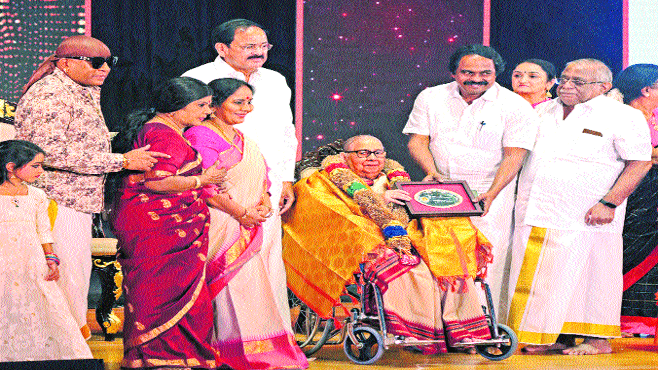 చెన్నై, డిసెంబరు 4 (ఆంధ్రజ్యోతి): గాన గంధర్వుడు ఘంటసాల వెంకటేశ్వర రావు ఒక ‘శతాబ్ది గాయకుడు’ అని చెప్పడంలో ఏమాత్రం అతిశయోక్తి లేదని మాజీ ఉపరాష్ట్రపతి వెంకయ్య నాయుడు అన్నారు. కేంద్ర పర్యాటక, సాంస్కృతిక శాఖ, కళాప్రదర్శిని ఆధ్వర్యంలో ఆదివారం చెన్నైలోని మ్యూజిక్ అకాడమీలో ఘంటసాల శతజయంతి వేడుకలు ఘనంగా నిర్వహించారు. ముఖ్య అతిథిగా వెంకయ్య ప్రసంగిస్తూ.. తరాలు మారినా ఘంటసాల స్వరం మాత్రం ఎన్నటికీ మారదన్నారు. ఆయన సంగీతాన్ని తరతరాల వారు ఆస్వాదిస్తున్నారని పేర్కొన్నారు. ఒక గాయకుడిగా, రెండు తరాలకు తన గాత్రాన్ని అందించారని చెప్పారు. తన స్వర విన్యాసంతో ఇంత మంచి అభిమానాన్ని సంపాదించుకున్న ఘంటసాలను ‘‘శతాబ్ది గాయకుడు’’ (మ్యూజీషియన్ ఆఫ్ ది సెంచరీ) అని చెప్పడంతో సందేహంలేదని పేర్కొన్నారు. సాధారణ వ్యక్తిగా జీవితాన్ని మొదలుపెట్టి గాయకుడిగానే కాకుండా, స్వాతంత్య్ర సమరయోధుడుగా, సంగీత దర్శకుడిగా అనేక పార్శ్వాల్లో చిరస్మరణీయంగా నిలిచిన ఘంటసాల జీవితం యువతకు ఎంతో ఆదర్శనీయమైనదని వెంకయ్య నాయుడు అన్నారు. ఈ సందర్భంగా, ప్రొఫెసర్ సుధారాణి రఘుపతి, ఎల్.ఆర్.ఈశ్వరి, నందిని రమణి, అవసరాల కన్యాకుమారి, తోట తరణి, డ్రమ్స్ శివమణి, దయాన్బన్లకు ‘కళా ప్రదర్శిని ఘంటసాల’ పురస్కారాలను ఆయన ప్రదానం చేశారు. ఈ కార్యక్రమాలన్నీ ‘కలైమామణి’ పార్వతి రవి ఘంటసాల పర్యవేక్షణలో నిర్వహించారు.