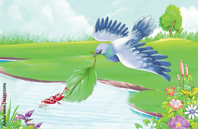 ఉదయాన్నే బీభత్సమైన వాన. అందునా గాలివాన. చెట్ల కొమ్మలు ఇరిగిపడుతున్నాయి. ఎక్కడ చూసినా నీళ్లు పారుతున్నాయి. గుబురు వేపచెట్టులోకి ఒక డేగ వచ్చి ఆ కొమ్మల మీద కూర్చున్న పావురాన్ని తరిమి కొట్టింది. ఆ పావురం గజగజ వణుకుతూ వేరే చెట్టును వెతుక్కోవాలని బయలుదేరింది. కాలువలో ఓ గండుచీమ కొట్టుకు వస్తుంటే.. పావురం చూసింది. ‘కాపాడండి..’ అని అరుస్తోంది చీమ. చీమను చూసి అయ్యో అనుకుంది పావురం. గజగజ వణుకుతూనే.. ఓ కానుగాకును తన ముక్కుతో చీమ దగ్గర వదిలేసింది. ఆకుపైకి చీమరాగనే.. ఆకును ముక్కున కరుచుకుని రివ్వున గాల్లోకి ఎగిరి.. ఓ చెట్టు కొమ్మపై కూర్చుంది పావురం. చీమ ఆనందానికి అవధుల్లేవు. ‘నీ రుణం తీర్చుకుంటా.. మిత్రమా. నా సాయం కావాలంటే చెప్పు’ అని చీమ అడుగుతూనే.. లోపల నవ్వుకుంది పావురం. సరేలే అన్నట్లు తలూపింది.