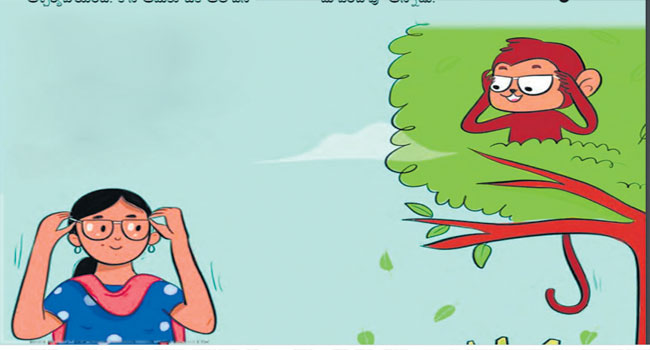 ఆ ఊరిలో ప్రియాంక అనే ఓ అల్లరిపిల్ల ఉండేది. ఆరో తరగతి చదివేది. తన అల్లరి చేష్టలకు ఇంట్లో వాళ్లు భయపెట్టేవాళ్లు. ఇళ్లంతా పీకి పందిరేసేది. ప్రతిదీ రిపేర్ చేసేది. మామిడి పండు తెంపమంటే.. వంద మామిడిపండ్లను రాళ్లతో కొట్టే బాపతు. ఒక రోజు తన తాతయ్య ఉదయాన్నే నిద్రలేచి.. పత్రిక చదువుతూ కళ్లద్దాలు పక్కనపెట్టాడు. వేపచెట్టు మీద ఉండే కోతి క్షణాల్లో ఆ కంటి అద్దాలను తీసుకెళ్లింది. పైగా చెట్టు ఎక్కి కళ్లద్దాలతో ఫోజు కొట్టింది. తాతయ్య తన మనమరాలిని పిలిచాడు. ఆ అల్లరిపిల్ల వచ్చింది. విషయం తెలుసుకుని.. తలపైకెత్తితే కళ్లద్దాలతో కోతి దర్జాగా చెట్టుమీద కూర్చుంది. క్షణాల్లో తన ప్లాస్టిక్ కళ్లద్దాలను తీసుకుని పెట్టుకుంది. కోతిని చూసింది. కోతి తనవైపు చూసింది. కళ్లద్దాలు పలుసార్లు తీసేసి మళ్లీ ఽపెట్టుకుంది. కోతి కూడా అలానే చేసింది. కొద్ది సేపయ్యాక తన కళ్లద్దాలను గడ్డిలోకి విసిరేసింది అల్లరిపిల్ల. కోతి కూడా అలానే గడ్డిలోకి కళ్లద్దాలను విసిరేసింది. వెంటనే కళ్లద్దాలు తీసుకుని తన తాతయ్యకు ఇచ్చింది. ఎంతో సంతోషంతో తాతయ్య కళ్లద్దాలను ధరించాడు. బావుంది.. ఈ అల్లరిపిల్ల- అల్లరి కోతి చేష్టలు అన్నాడు.. నవ్వుతూ!