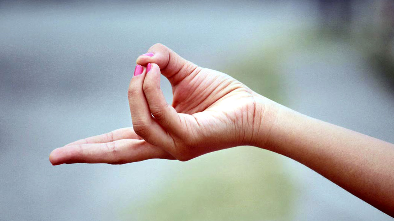 బొటన వేలు, ఉంగరపు వేలు, చిటికిన వేళ్లను బొమ్మలో చూపించిన విధంగా తాకించాలి.