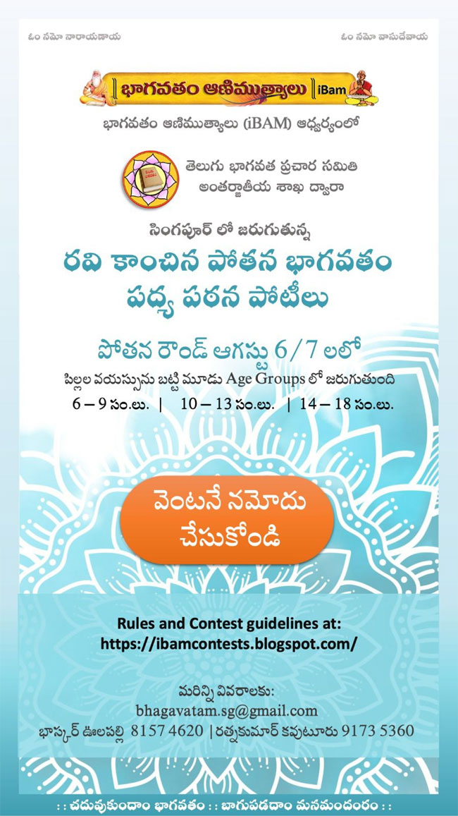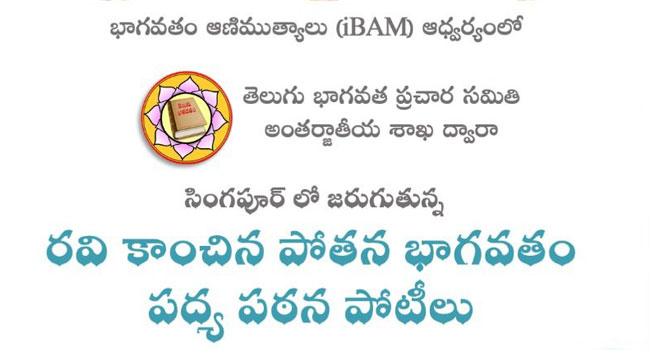 i-BAM భాగవతం ఆణిముత్యాలు ఆధ్వర్యంలో తెలుగు భాగవత ప్రచార సమితి అంతర్జాతీయ శాఖ ద్వారా జరుగుతున్న రవి కాంచిన పోతన భాగవతం పద్య పఠనపు పోటీలు - 2022 సింగపూర్లో జరుగుతున్నాయి