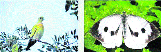 కనువిందు చేస్తున్న పచ్చరంగు పావురం, సీతాకోక చిలుకలు