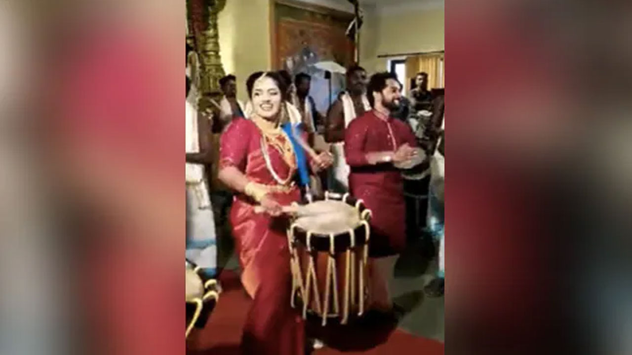 పెళ్లి అనగానే అమ్మాయిలు సిగ్గుల మొగ్గలవుతారు. ఎంతో బిడియంగా పెళ్లి వేడుకలో పాల్గొంటారు. అయితే ప్రస్తుతం ట్రెండ్ మారింది. సంగీత్ పేరుతో వివాహ వేడుకలో డ్యాన్స్ చేస్తున్నారు. వరుడు, బంధుమిత్రులతో కలిసి ఆడి పాడుతున్నారు. తాజాగా కేరళలో జరిగిన ఓ వివాహ వేడుకలో ఓ వధువు అత్యద్భుతంగా డ్రమ్స్ (Kerala Bride Plays Chenda) వాయించింది. వధువు ట్యాలెంట్కు మిగతా వారితో పాటు వరుడు కూడా ఫిదా అయ్యాడు. ఆ వీడియో సోషల్ మీడియాలో వైరల్గా (Viral Video) మారింది.
