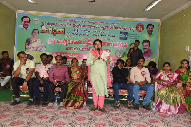మంచిర్యాల కలెక్టరేట్, జూన్ 4: కళలు సమాజంలో నైతిక విలువలు, మానవ సంబంధాలపై అవగాహన కల్పించేందుకు దోహదపడతాయని కలెక్టర్ భారతి హోళికేరి పేర్కొన్నారు. శనివారం జిల్లా కేంద్రంలోని ఎఫ్సీఏ ఫంక్షన్హాలులో నిర్వహించిన శ్రీశ్రీ కళావేదిక ప్రపంచ రంగ స్థలం కార్యక్రమానికి ముఖ్య అతిథిగా హాజరై నాట్య ప్రదర్శనను తిలకించారు. అనంతరం ఉత్తమ ప్రతిభ కనబర్చిన వారికి అవార్డులు, సన్మాన పత్రాలతో సన్మానించారు. కలెక్టర్ మాట్లాడుతూ జిల్లా లో కళాకారులకు కొదువ లేదని, జాతీయ అంతర్జాతీ య స్ధాయిలో రాణిస్తున్నారన్నారు. కళాకారులకు ప్రభుత్వ సహకారం ఎప్పుడు ఉంటుందని తెలిపారు. ఈ ప్రదర్శనకు పలు రాష్ట్రాల నుంచి వెయ్యి మంది కళాకారులు పాల్గొన్నారు. ఉదయం 11 గంటలకు ప్రారంభమైన ఈ కార్యక్రమం 24 గంటల 24 నిమి షాల 24 సెకన్ల నాన్స్టాప్ ప్రదర్శనతో రికార్డు నెల కొల్పి గుర్తింపు సాధించాలన్నారు. కళాకారుల అవా ర్డుల నిమిత్తం రూ.2 లక్షల విరాళం అందజేసిన అం జని పుత్ర సంస్థ చైర్మన్ గుర్రాల శ్రీధర్ను అభినందిం చారు. ఎమ్మెల్యే దివాకర్రావు మాట్లా డుతూ కళలతోనే సమాజ అభివృద్ధి, ప్రజల్లో చైతన్యానికి ఎంతగానో దోహదం చేస్తాయని, కళాకారులను గౌరవించాలన్నారు. 200 మంది కళాకారులు పాల్గొని ప్రదర్శనలు ఇచ్చారు. ప్రదర్శనలు ఆదివారం ముగియనున్నాయి. శ్రీశ్రీ రంగస్థలం సంస్థ జాతీయ చైర్మన్ ప్రతాప్, రాష్ట్ర కోఆర్డినేటర్ భాగ్యలక్ష్మీ, మున్సిపల్ కమిషనర్ బాలకృష్ణ, సంస్థ సమన్వయకర్తలు గుండేటి యోగేశ్వర్, రాంప్రకాష్, రమావతి, నరేంద్ర, భరత్, పిల్లి రవి, సంతోష్, గడికొప్పుల తిరుపతి, సూరినేని కిషన్, మహేందర్ పాల్గొన్నారు.