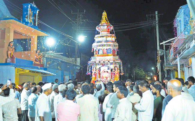 తాండూరు/బొంరాస్పేట్/పరిగి, ఏప్రిల్ 21 : తాండూరు పట్టణంలో శ్రీభావిగి భద్రేశ్వరస్వామి బ్రహ్మోత్సవాల్లో భాగంగా గురువారం రాత్రి స్వామివారి పల్లకీసేవ కనులపండువగా కొనసాగింది. భద్రేశ్వర చౌక్ నుంచి గాంధీచౌక్, మఠం గల్లీ తదితర వార్డులమీదుగా పల్లకీని ఊరేగింపుగా తీసుకెళ్లారు. పట్టణవాసులు స్వామివారికి హారతిచ్చి పూజలు నిర్వహిస్తున్నారు.