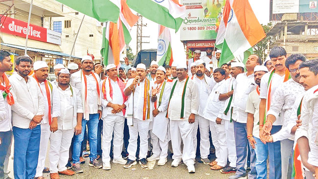 కందుకూరు ఆగస్టు 9 : దేశానికి స్వాతంత్య్రం తెచ్చిన సమరయోధులకు బీజేపీ ప్రభుత్వ విస్మరించిందని డీసీసీ అధ్యక్షుడు చల్లా నర్సింహ్మరెడ్డి, పీసీసీ కార్యదర్శి ఎల్మటి అమరేందర్రెడ్డి పేర్కొన్నారు. భారత స్వాతంత్య్ర 75 ఏళ్ల వజ్రోత్సవాలను పురస్కరించుకొని పీసీసీ ఆదేశానుసారం మంగళవారం పులిమామిడి నుంచి జైత్వారం, కొత్తగూడ గ్రామాల మీదుగా కందుకూరు వరకు చేపట్టిన ఆజాదీ కా గౌరవ్ పాదయాత్రలో వారు పాల్గొని మాట్లాడారు. బీజేపీ నాయకులు ఏనాడూ స్వాతంత్య్ర ఉద్యమంలో పాల్గొన లేదన్నారు. ఎనిమిదేళ్ల బీజేపీ పాలనలో దేశ ఆర్థిక వ్యవస్థ అస్తవ్యస్తంగా మారిందని ఆరోపించారు. మతం పేరుతో మధ్య చిచ్చులు పెడుతూ కేంద్రంలో పాలన సాగిస్తున్న బీజేపీ ప్రభుత్వంపై దేశ ప్రజలు విసిగి పోయారన్నారు. ఈనెల 15వరకు రంగారెడ్డి జిల్లాలో చేపట్టనున్న పాదయాత్రకు పార్టీ శ్రేణులు పాల్గొని విజయవంతం చేయాలని కోరారు. అనంతరం కందుకూరులోని బీఆర్ అంబేద్కర్ విగ్రహానికి పూలమాల వేశారు. కార్యక్రమంలో పార్టీ మండల శాఖ అధ్యక్షుడు ఎస్.కృష్ణానాయక్, జడ్పీ మాజీ ఫ్లోర్లీడర్ ఏనుగు జంగారెడ్డి, నాయకులు దేప భాస్కర్రెడ్డి, డిల్లీ శ్రీధర్, చిగిరింత నర్సింహారెడ్డి, వంగేటి ప్రభాకర్రెడ్డి, పెద్దబావి వెంకట్రెడ్డి, ఎండి అబ్జల్బేగ్, బొక్క భూపాల్రెడ్డి, బంగారుబాబు, బుక్క ప్రశాంతిరెడ్డి, సరికొండ మల్లేష్, కె.వెంకటేష్, టి.వినోద్చారి, బాలునాయక్, జైహిందు, సిద్దాల శ్రీశైలం, ఎస్.రాంరెడ్డి, ప్రశాంత్కుమార్, జి.సుధాకర్రెడ్డి, మహేందర్, సరికొండ జగన్, సౌడపు వెంకటే్షగౌడ్, రియాజ్ఖాన్ పాల్గొన్నారు.