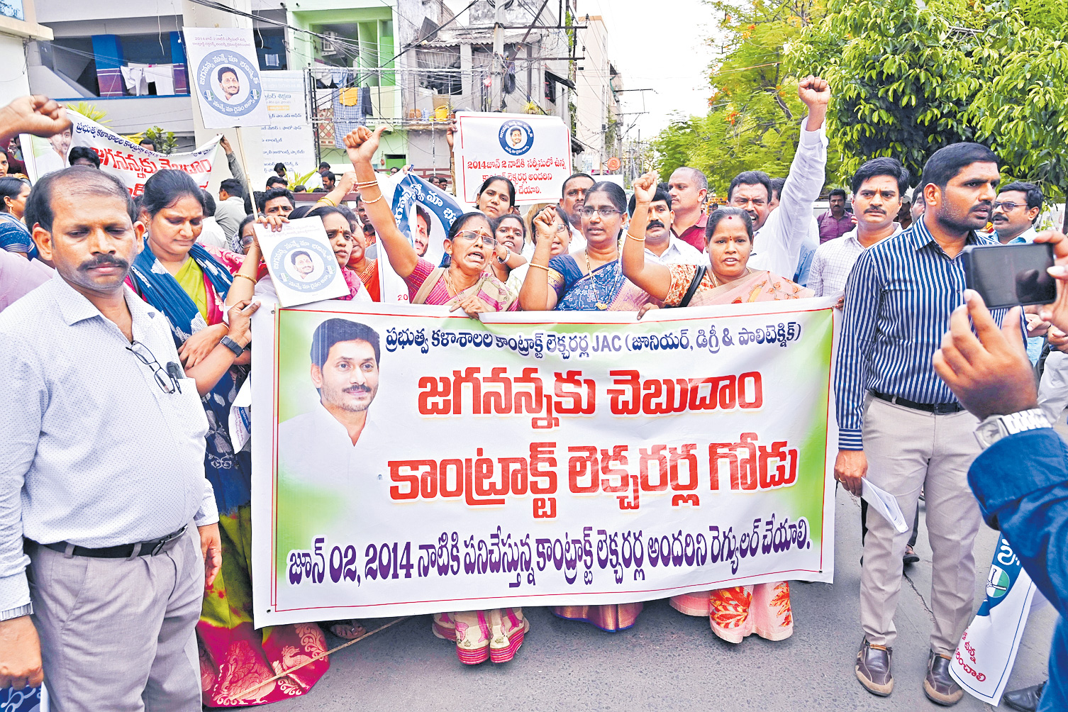 ప్రభుత్వ జూనియర్ కళాశాలలు, డిగ్రీ కళాశాలలు, పాలిటెక్నిక్ కళాశాలల్లో పనిచేస్తున్న కాంట్రాక్ట్ లెక్చరర్లందరినీ క్రమబద్ధీకరించాలని ప్రభుత్వ కాంట్రాక్ట్ లెక్చరర్ల జేఏసీ ప్రభుత్వాన్ని డిమాండ్ చేసింది.