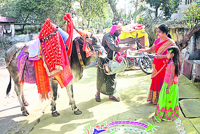 భోగి పండుగ రోజున అనంతపురం నగరంలో గంగిరెద్దులు సందడి చేశాయి. ప్రకాశం జిల్లా మార్కాపురం సమీపంలోని దూలంవారిపల్లెకు చెందిన గంగిరెద్దుల రంగయ్య కుటుంబం నెల క్రితమే జిల్లాకు వచ్చింది. పది బృందాలుగా విడిపోయి.. పల్లెలు, పట్టణాల్లో పర్యటిస్తున్నారు. కనుమరుగవుతున్న గంగిరెద్దుల ఆటను ఈ తరానికి పరిచయం చేసేందుకు వీరి కుటుంబం ఇంకా వృత్తిని కొనసాగిస్తోంది. ఇంటి వద్దకు వచ్చిన గంగిరెద్దుకు మహిళలు సంప్రదాయంగా పూజలు నిర్వహించి.. కానుకలను సమర్పించారు.