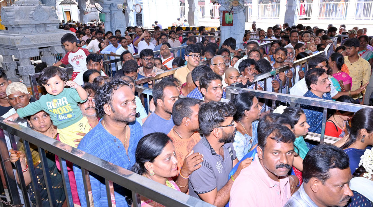 ఐరాల(కాణిపాకం), జూలై 16: స్వయంభు కాణిపాక వరసిద్ధి వినాయక స్వామి ఆలయం ఆదివారం భక్తుల రద్దీతో కిటకిటలాడింది. ఉదయం నుంచి వేలాదిగా భక్తులు స్వామి దర్శనార్థం కాణిపాకం విచ్చేశారు. దీంతో ఆలయ క్యూలైన్లు పూర్తిగా భక్తులతో నిండి పోయాయి. స్వామి దర్శనానికి సుమారు మూడు గంటల సమయం పట్టింది. క్యూలైన్లలో భక్తుల మధ్య తొక్కిసలాటలు జరగకుండా అధికారులు పర్యవేక్షించారు. భక్తులకు అవసరమైన అన్ని ఏర్పాట్లను అధికారులు పర్యవేక్షించారు.