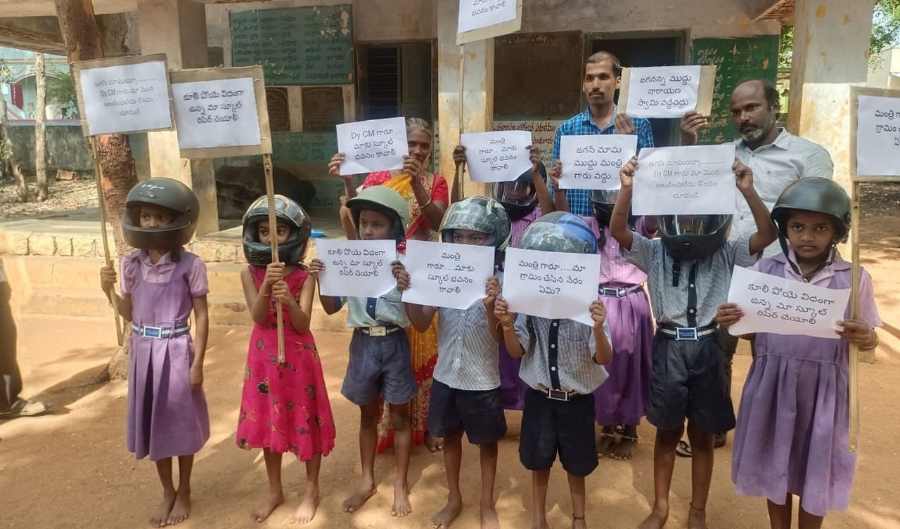 తలకు హెల్మెట్లు ధరించారు. డిప్యూటీ సీఎం.. మా గ్రామం చేసిన నేరమేమి? మాకు స్కూల్ భవనం కావాలి. జగన్ మామ ముద్దు.. డిప్యూటీ సీఎం వద్దు.. అంటూ ప్లకార్డులు ప్రదర్శించారు. భవన పెచ్చులూడుతుండటంతో తలకు గాయం కాకుండా హెల్మెట్ వేసుకోవాల్సి వస్తుందన్నారు.