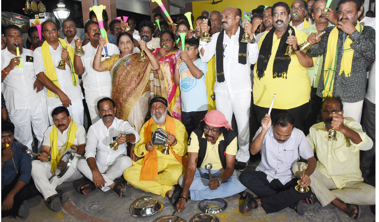 తిరుపతి, సెప్టెంబరు 30 (ఆంధ్రజ్యోతి): చంద్రబాబు అరెస్టు తీరుకు నిరసనగా తెలుగుదేశం ఇచ్చిన పిలుపు మేరకు శనివారం రాత్రి జిల్లావ్యాప్తంగా పార్టీ శ్రేణులు మోత మోగించాయి.వారికి దీటుగా సామాన్య జనం కూడా పెద్దఎత్తున స్వచ్ఛందంగా పాల్గొన్నారు.ఏర్పేడు మండలం మడిబాక గ్రామంలోని రామాలయంలో మహిళలు దీపాలు చేతబట్టుకుని గుడి గంట మోగించారు. తారాజువ్వల వెలుగులు, బాణాసంచా పేలుళ్ళతో అదే మండలంలోని పల్లం గ్రామంలో ఆకాశం దద్ధరిల్లిపోయింది. ఆ మండల కేంద్రం దళితవాడలో చప్పట్ల నడుమ గ్రామస్తులు కంచాలు మోగించారు. డక్కిలి మండలం నరసనాయుడుపల్లిలో కొవ్వొత్తుల వెలుగులో మహిళలు, చిన్నారులు హారన్లు మోగించారు. శ్రీకాళహస్తిలోని ఓ ట్రాక్టర్ ట్రాలీ వర్క్షాపు వద్ద ఇనుపరేకులపై అభిమానులు మోత మోగించారు. అదే పట్టణంలో గాండ్ల సామాజికవర్గానికి చెందిన అభిమానులు నూనె డబ్బాలు మోగించి తమ అభిమానం చాటుకున్నారు. సత్యవేడులో వినూత్న రీతిలో అభిమానులు సైరన్ మోగించారు. వరదయ్యపాలెం మండలం కడూరులో ముస్లిం మైనారిటీలు బిందెలు మోగించారు. తిరుపతిలో మాజీ ఎమ్మెల్యే సుగుణమ్మ తన నివాసంలో కంచం మోగించి నిరసన వ్యక్తం చేయగా తిరుపతి పార్లమెంటు టీడీపీ అధ్యక్షుడు నరసింహయాదవ్ నివాసంలో ఆయన సతీమణి చిన్నారులతో కలసి కంచాలు మోగించారు. నగరంలోని తనపల్లి సర్కిల్లో టీడీపీ రాష్ట్ర అధికార ప్రతినిధి మద్దిపట్ల సూర్యప్రకాష్, తెలుగుయువత రాష్ట్ర ప్రధాన కార్యదర్శి రాగల ఆనంద గౌడ్ హారన్లు మోగించారు. చంద్రగిరిలో కార్యకర్తలతో కలసి ఇంఛార్జి పులివర్తి నానీ హారన్లు మోగించగా వెంకటగిరిలో బ్యాండు సన్నాయి, డప్పు వాయిద్యాల నడుమ టీడీపీ శ్రేణులు కంచాలు మోగించారు. గూడూరులో మాజీ ఎమ్మెల్యే పాశిం సునీల్ నివాసం వద్ద పార్టీ నేతలు, కార్యకర్తలు డప్పు చప్పుళ్ళ నడుమ హారన్, విజిల్, కంచాలు మోగించి నిరసన వ్యక్తం చేశారు. నాయుడుపేటలో టీడీపీ కార్యాలయం వద్ద మాజీ ఎమ్మెల్యే నెలవల సుబ్రమణ్యం సహా కార్యకర్తలు, మహిళలు డ్రమ్ములు, కంచాలు, విజిల్ మోగించారు. ఓజిలి పాత పంచాయతీ కార్యాలయం వద్ద గ్రామస్తులు డ్రమ్ములు మోగించారు. సూళ్ళూరుపేట, కోట, వరదయ్యపాలెం మండల కేంద్రాల్లో టీడీపీ వర్గీయులు విజిల్స్ వేస్తూ ర్యాలీలు నిర్వహించారు. శ్రీకాళహస్తిలో మాజీ ఎమ్మెల్యే ఎస్సీవీ నాయుడు తన నివాసం వద్ద కార్యకర్తలతో కలసి విజిలేశారు. పట్టణంలోని పూసల వీధిలో కూడా కార్యకర్తలు కంచాల మోతతో సందడి చేశారు. కేవీబీపురం, బీఎన్ కండ్రిగ, పుత్తూరు ఎస్బీఐ కాలనీ, పిచ్చాటూరు మండలం చెంచురాజు కండ్రిగలో కంచాలతో పాటు ద్విచక్ర వాహన హారన్లు మోగించారు. కీలపూడిలో మహిళలు కంచాలపై గరిటెలతో కొట్టి శబ్దాలు చేశారు. వడమాలపేట మండలం తట్నేరిలో విజిల్స్ మారుమోగ